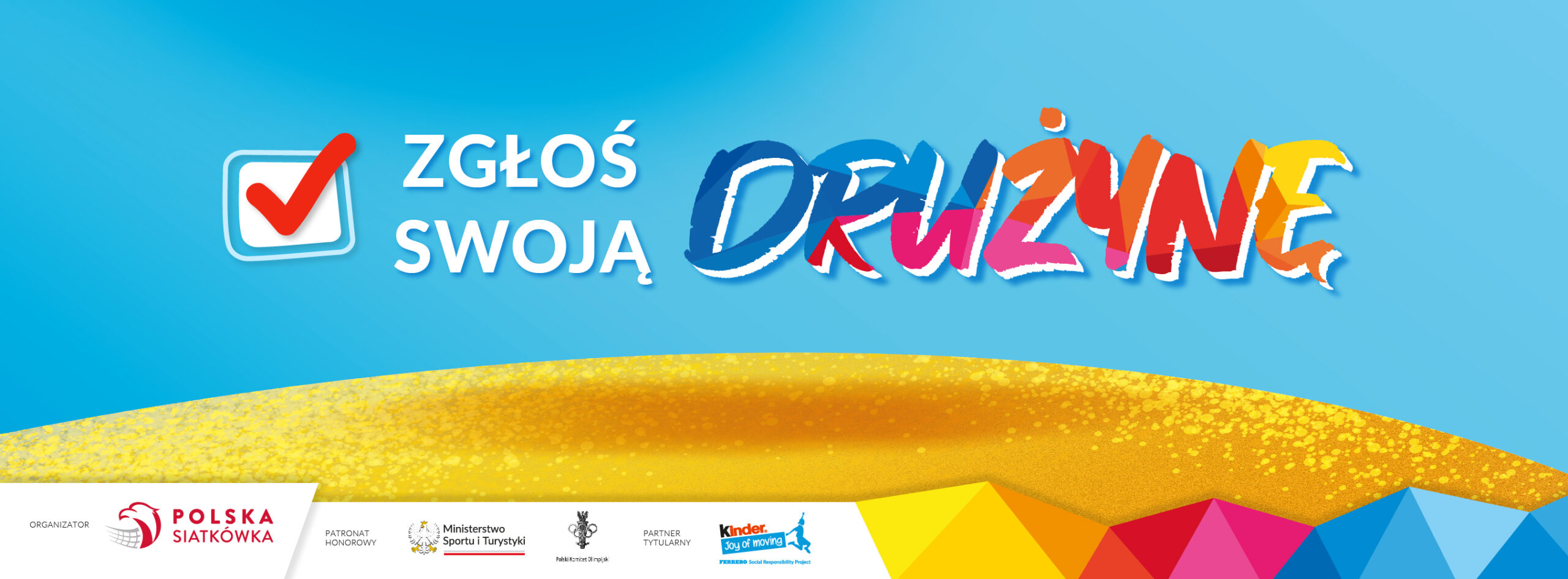 Startuje I edycja Ogólnopolskich Mistrzostw w Minisiatkówce Plażowej o Puchar KINDER Joy of moving! Nie czekaj! Zgłoś swoją drużynę do udziału w tej historycznej edycji rozgrywek! W Ogólnopolskich Mistrzostwach w Minisiatkówce Plażowej o Puchar KINDER Joy of moving mogą wziąć udział dzieci z klas IV-VI szkoły podstawowej, które reprezentują szkoły, kluby sportowe, zespoły amatorskie, akademie siatkarskie, a także stowarzyszenia, fundacje oraz podmioty niezrzeszone. Rozgrywki prowadzone są w podziale na dwa etapy: eliminacje wojewódzkie oraz Wielki Finał, do którego awansują po trzy najlepsze drużyny z kategorii U-11, U-12, U-13 dziewcząt i chłopców. Podczas gry na piasku młode zawodniczki i zawodnicy będą rozwijać swoje umiejętności sportowe, a przy tym świetnie się bawić oraz nawiązywać przyjaźnie. Przez ostatnie 30 lat rozgrywki minisiatkówki toczyły się tylko w hali. Od tego sezonu to zmieniamy! Z wielką przyjemnością i radością chcemy wspólnie z Wami napisać nowy rozdział w historii minisiatkówki. Dlatego nie czekaj, tylko zgłoś swoją drużynę do Ogólnopolskich Mistrzostwach w Minisiatkówce Plażowej o Puchar KINDER Joy of moving! W jaki sposób można zgłosić chęć udziału w Mistrzostwach? Bardzo prosto! Wystarczy zgłosić swoją drużynę e-mailowo lub telefonicznie do koordynatora Mistrzostw, wyznaczonego przez Wojewódzki Związek Piłki Siatkowej. Dane kontaktowe do poszczególnych koordynatorów znaleźć można w zakładce KONTAKT. Organizacją rozgrywek na etapie wojewódzkim zajmują się Wojewódzkie Związki Piłki Siatkowej, które są odpowiedzialne za przygotowanie systemu i harmonogramu rozgrywek. Dołącz do naszej siatkarskiej rodziny, przeżyj fanatyczną sportową przygodę i zostań Mistrzem Radości na plaży!