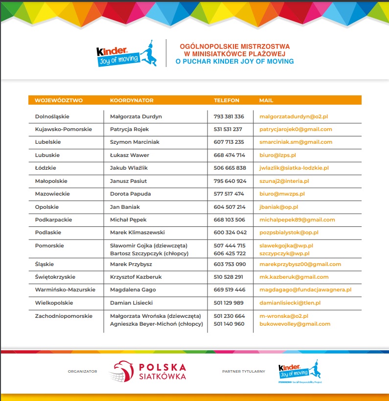 Na naszej stronie znajdziesz dane kontaktowe do wszystkich koordynatorów wojewódzkich w danym regionie. Kliknij - Lista koordynatorów. Prosimy o zwrócenie szczególnej uwagi, ponieważ w niektórych województwach mamy podział na osoby odpowiedzialne za organizację rozgrywek dziewcząt, a osobno chłopców.
